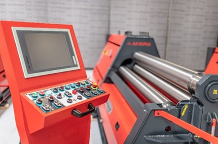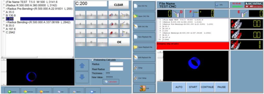 Система AK 400 CNC працює на основі інфраструктури PLC та програмного забезпечення, встановленого на промисловому ПК. При прокатуванні деталей із різними радіусами система визначає радіуси згинів та довжину заготовки, після чого розраховує позиції для осей, забезпечуючи наближення до потрібних радіусів. Далі вносяться необхідні коригування, і програма переходить у фінальний стан.